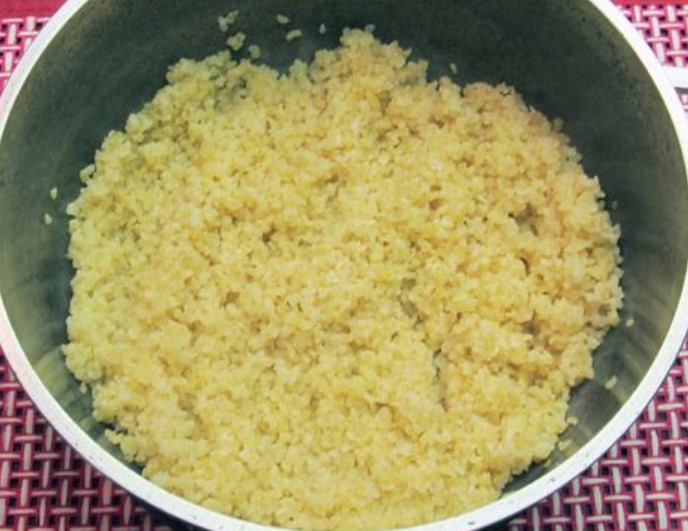 Then pour 250 ml of water into bulgur. Add a little salt (1 pinch), not forgetting that then the cheese will be added, which is already salty.