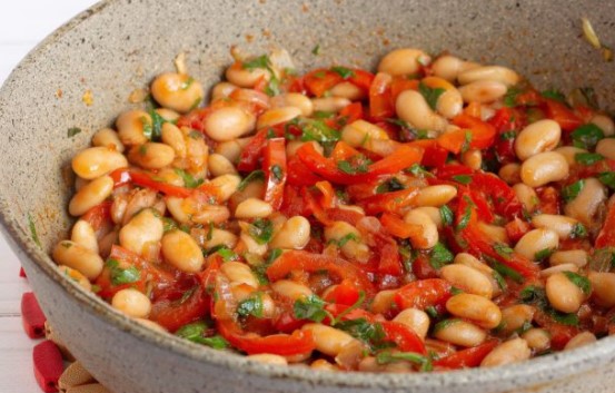 Fry the onion in a frying pan in a little olive oil, then add the pepper. After a couple of minutes, beans and tomato sauce are added. Simmer for 2-3 minutes and add parsley. Place clean lettuce on top of the tortilla.