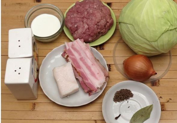 Cut the bacon into small cubes and fry in a preheated pan. Then add the onion to the bacon in the pan and fry it a little. Add cabbage to the onion with lard, mix. Reduce heat and simmer for 10-15 minutes. Add bay leaves, caraway seeds, chopped cloves. Simmer for several minutes, stirring constantly. We remove the bay leaf.