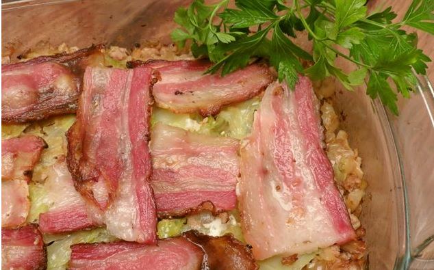 Cabbage casserole with minced meat and bacon is a simple and very good option for a delicious lunch or dinner. Fry cabbage with minced meat and onions in lard, lay out all the ingredients in layers, and then bake in the oven with bacon. A hearty casserole for lovers of cabbage and meat culinary “stories”!