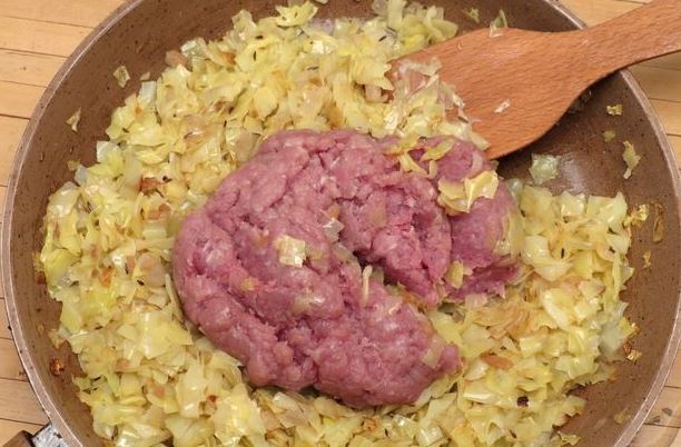 Salt and pepper the vegetables. Add minced meat to vegetables, mix and fry, stirring occasionally, for 5-7 minutes.