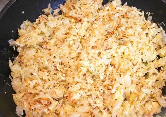 Stir the eggs with a whisk and pour into the cabbage. Add salt, pepper (you can add chopped herbs). Stir and fry a little. Let the filling cool.