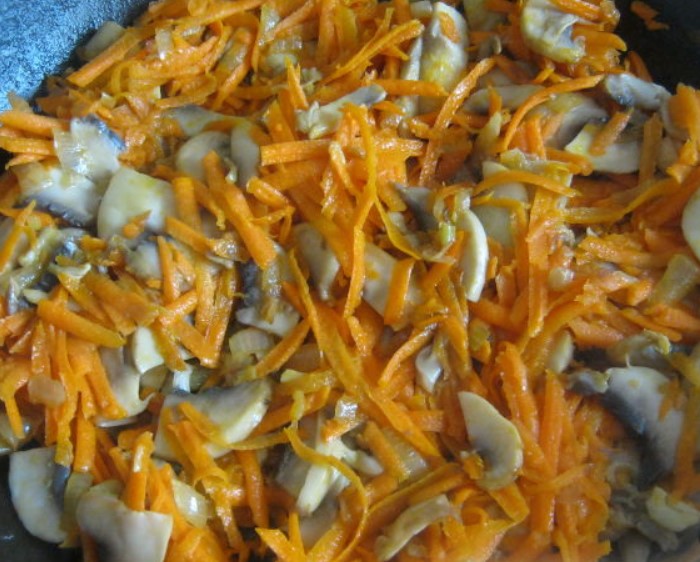 Preheat a frying pan, pour in vegetable oil. Place 2/3 of the onions and carrots and the mushrooms in the pan. Simmer vegetables with mushrooms, stirring occasionally, over medium heat for 8-10 minutes.