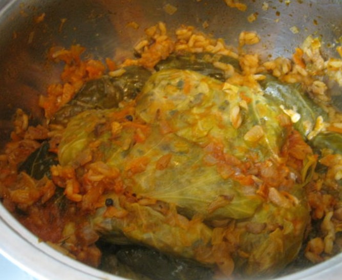 Mix rice, mushrooms with vegetables and herbs. Add salt and pepper to taste. Put 1-2 teaspoons of minced meat on prepared cabbage leaves and wrap in the form of an envelope. Put cabbage trimmings on the bottom of the cauldron Place cabbage rolls on top in a cauldron.