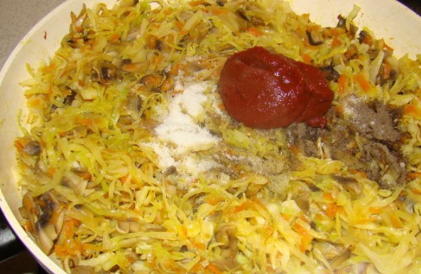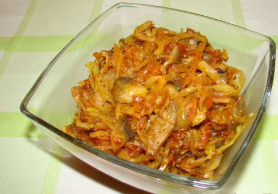You can easily and quickly cook stewed cabbage with mushrooms. This cabbage dish is a great side dish, and cabbage with mushrooms can be a good filling for pies or other baked goods.