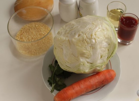 Chop the cabbage. Peel the carrots and grate on a coarse grater. Rinse the rice thoroughly.