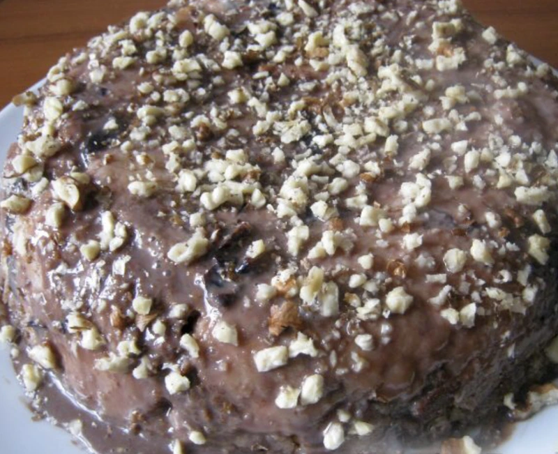 Top the Pancho cake with prunes can be greased with chocolate icing, condensed milk, or cream, sprinkled with walnuts. Pancho cake with prunes, sour cream, and walnuts is ready.