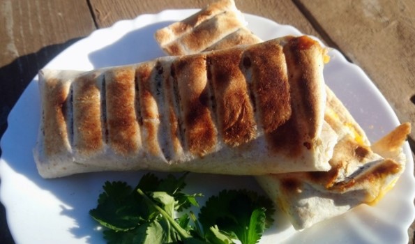Roast the turkey thigh over charcoal. We rub both types of cheese. The meat is baked, cut into small pieces. Next, put the meat on the tortillas.