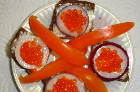 If a jar of caviar appears in the refrigerator for the holiday, you can make original canapes with red caviar – small sandwiches with black bread that look like sushi.