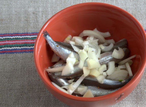 We clean the capelin carcasses from the entrails and heads, put them in the marinade. In the next step, chop the onions with random strips and add them to the fish. We combine all the ingredients, send the capelin to marinate in a cold place for 2-3 hours.