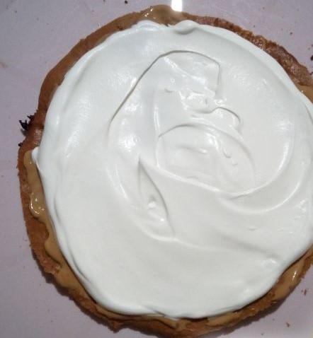 Alternate between cakes, caramel sauce, and cream. Lubricate the entire structure generously with whipped cream.