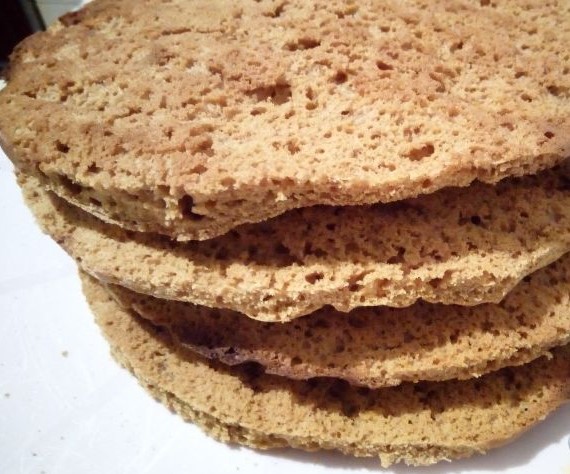 Draw a circle with a diameter of 20-25 cm on parchment. (The number of cakes will depend on the dia of the circle.) Put a couple of tablespoons of dough on this circle, distribute evenly. Send to an oven preheated to 170 degrees. The cakes are baked quickly, 6-8 minutes. After 6 minutes, you can check the cake for readiness by pressing on it with your finger. You will feel that the dough is already well baked, but do not overdry the cakes.