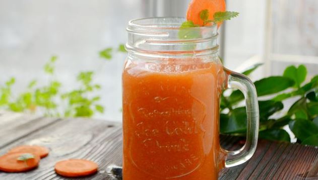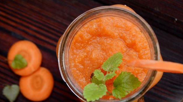 Decorate the smoothie glass with a slice of fresh carrots. Serve the vitamin smoothie immediately.