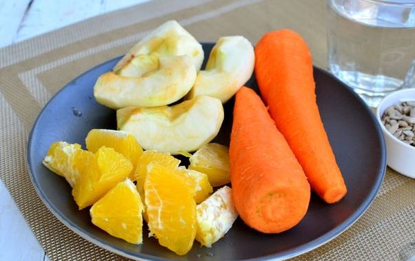 Peel carrots and apples and wash thoroughly. Remove the seeds from the apple. Coarsely chop the apple. Peel the orange, disassemble it into slices and, if possible, remove the white partitions. If desired, the orange slice can be set aside for serving.