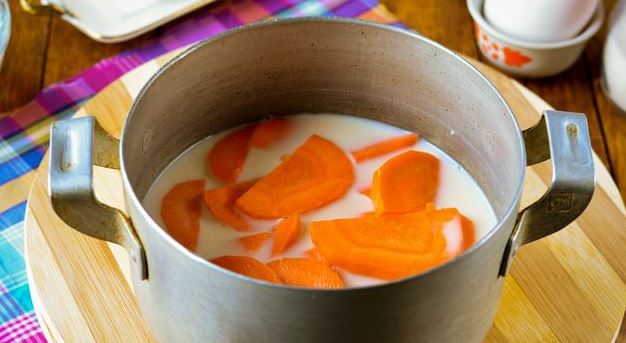 Cut the carrots into thin semicircles. Pour milk over the carrots and simmer until soft, 15-20 minutes.