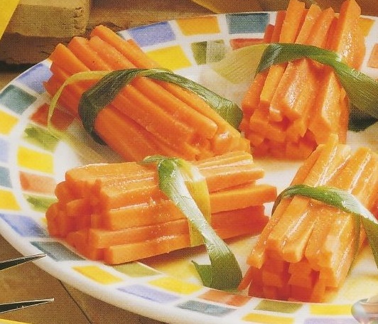 For this dish, carrots are cut into long cubes and prepared with the addition of orange juice and cumin.