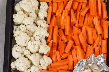 Line a baking sheet with baking paper. Place the carrots and cabbage on a baking sheet. Wrap the cloves of garlic, without peeling, in a piece of foil and also send to a baking sheet.