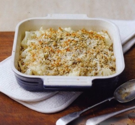 Prepare the powder. Combine bread crumbs, parmesan, and herbs in a bowl. Sprinkle this mixture over the cauliflower in a mold.