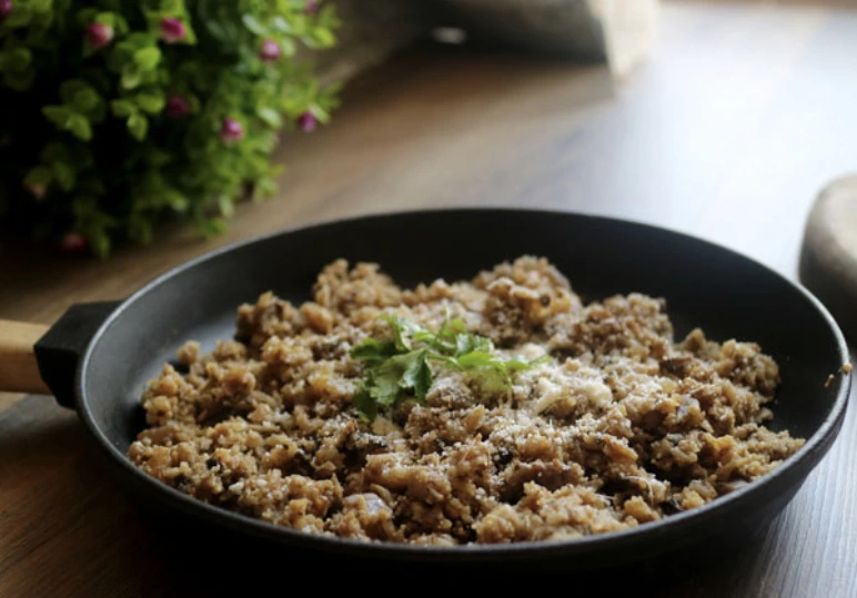 Cauliflower keto rice goes well with vegetables, fish, and meat. I made a version with mushrooms, parmesan, and ghee. If you are observing Christian fasts, use olive oil and nutritional yeast for acheesy flavor.