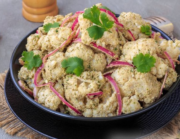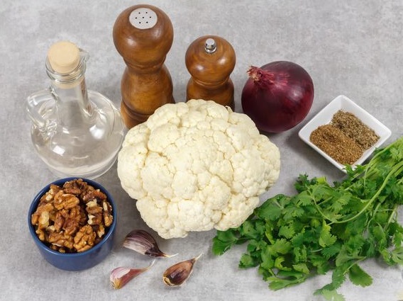A healthy and unusual salad of boiled cauliflower with sweet red onions and a dressing of garlic, roasted walnuts, and fresh cilantro. This is a great independent dish for vegetable lovers or an excellent side dish for meat.