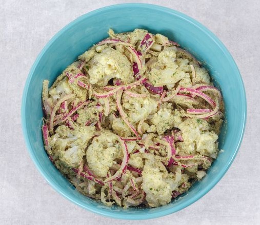 Disassemble the chilled cauliflower into medium-sized florets and place in a salad bowl. Add pickled onions and dressing.