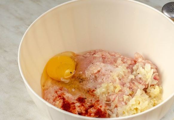 Put the cabbage in salted boiling water and boil for 7 minutes. Put an egg, fried onion with garlic, salt, pepper, half paprika in the minced meat.