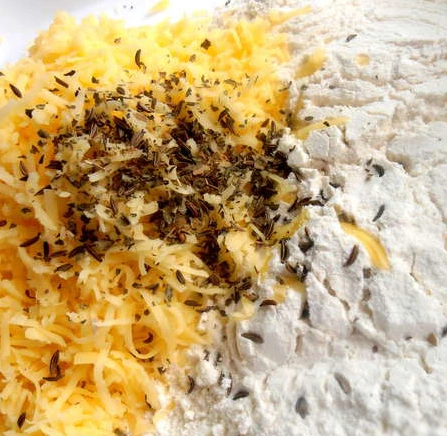 Mix part of the flour with baking powder, pour the cheese into it. Add a little seasoning to the resulting mixture: a third of a teaspoon of basil and the same amount of cumin.