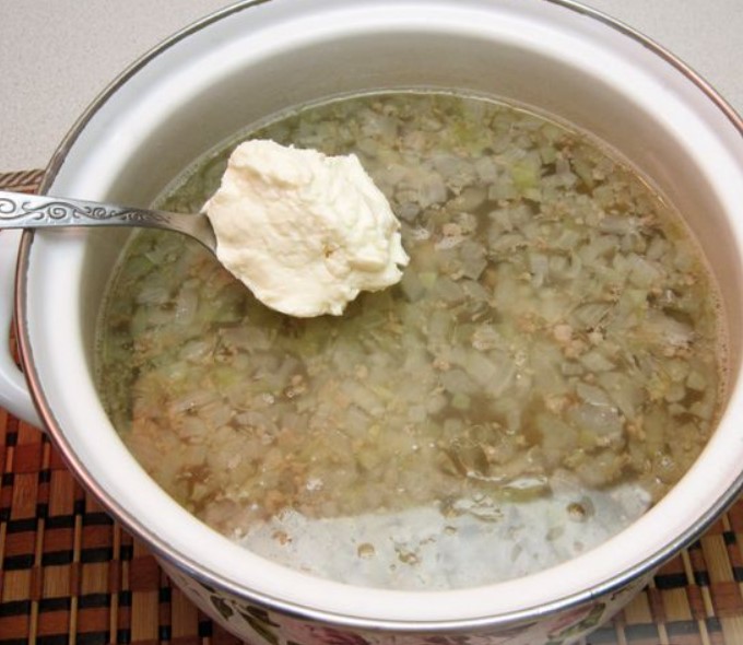 Cheese Soup with Minced Meat and Pickled Mushrooms