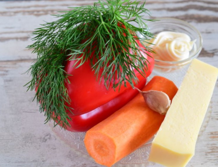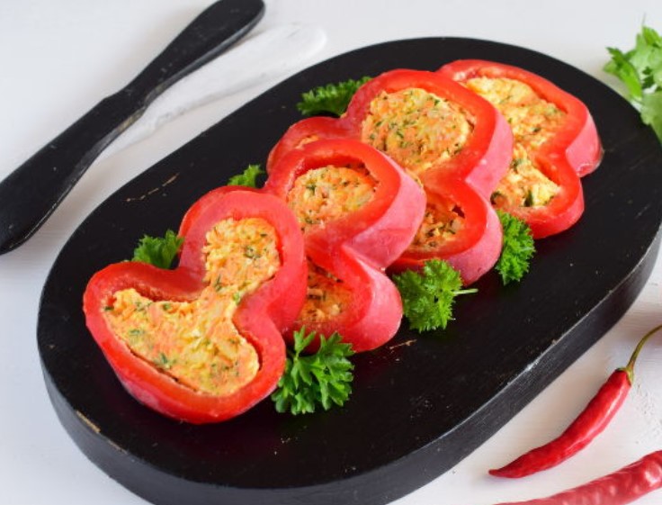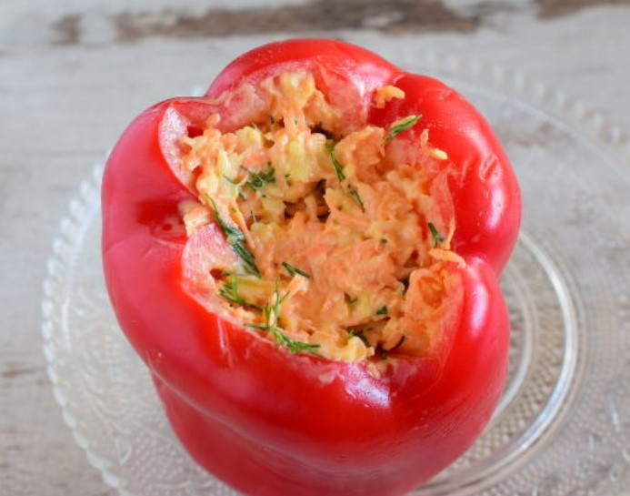 Recipe for an excellent appetizer of fresh bell peppers stuffed with cheese, carrots, garlic and herbs. This quick-to-prepare and simple appetizer will help you out in case of unexpected guests.