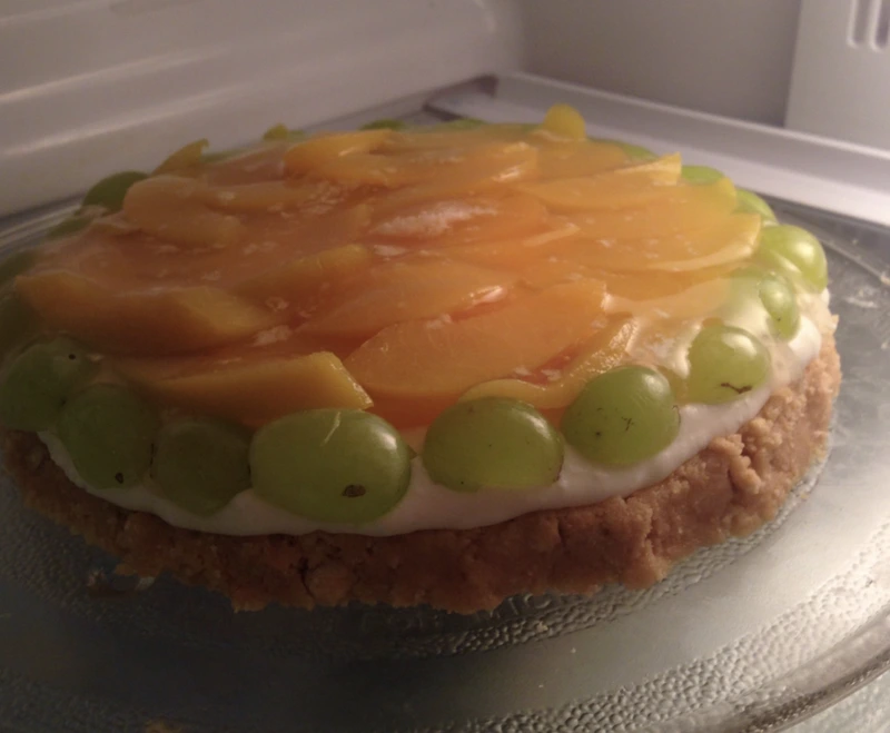 Cut the peaches into slices and place them on the cheesecake that has frozen by this time. Gently pour the cooled gelatin syrup over the cheesecake and refrigerate for another 2-3 hours.