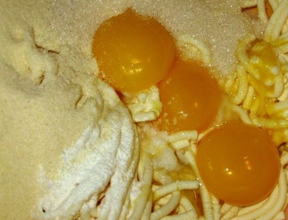 Separate the egg whites from the yolks. Pass the cottage cheese through a meat grinder. Add sugar, semolina, baking powder, and yolks to the curd. Mix everything into a homogeneous mass.