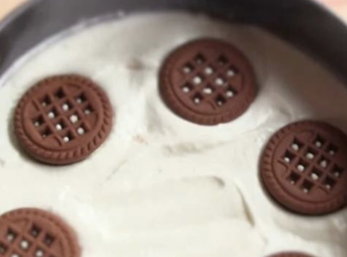 7. Send some of the fillings into the mold, flatten, then lay out the cookies and cover with the filling again. Alternate layers like this. Cover with cling film and refrigerate for 2 hours.