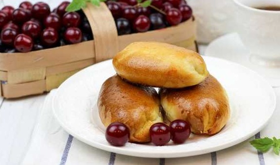 Put a baking sheet in an oven preheated to 180-190 degrees, bake pies with cherries for about 20-30 minutes.