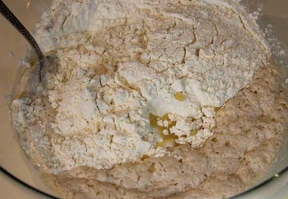 When the dough comes up (covered with bubbles), add the remaining flour, salt and vegetable oil. Mix.