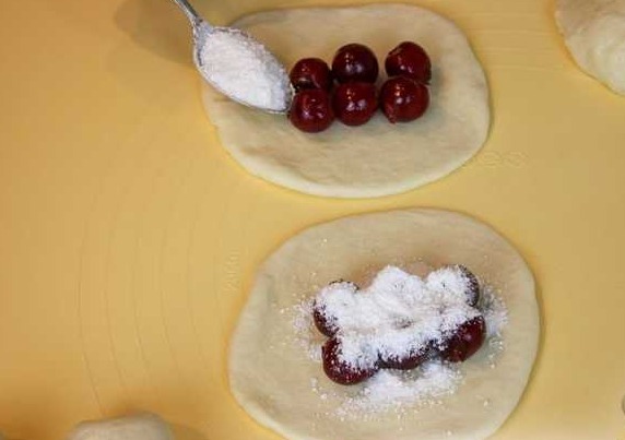 Roll each ball of dough into a cake. Do not add flour. Lubricate hands, rolling pin and work surface with vegetable oil, if necessary. The dough does not need to be hammered with flour, then the pies will be soft and airy. Put berries on each cake, about 5-6 pieces. Sprinkle on top with a mixture of starch and sugar (1 teaspoon each). Connect the edges of the dough and form patties.