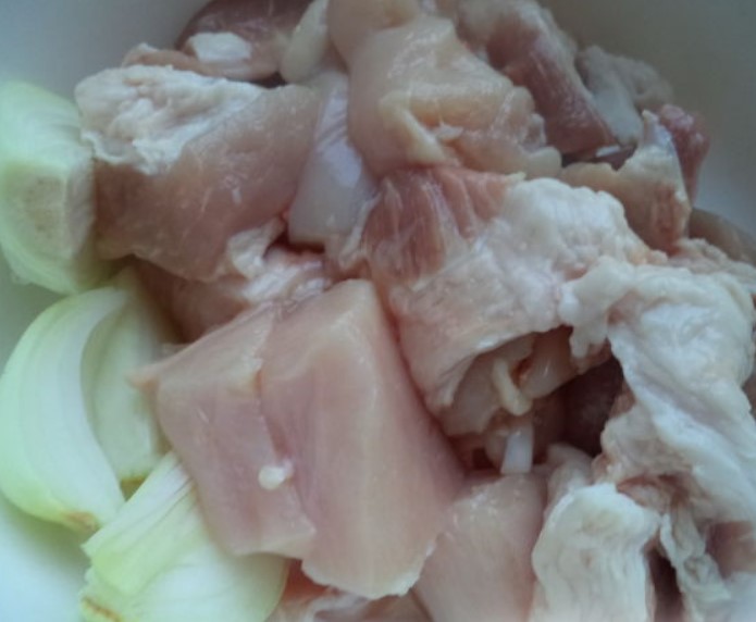The meat is washed, cut into pieces. The onions are peeled, washed, cut into pieces.