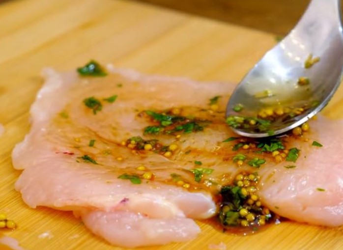 Brush the chicken fillet with the marinade on one side. Then transfer to parchment and grease with another.