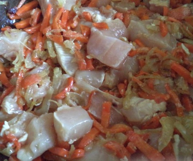 Add prepared chicken fillet. Fry everything together for about 10 minutes, stirring occasionally.