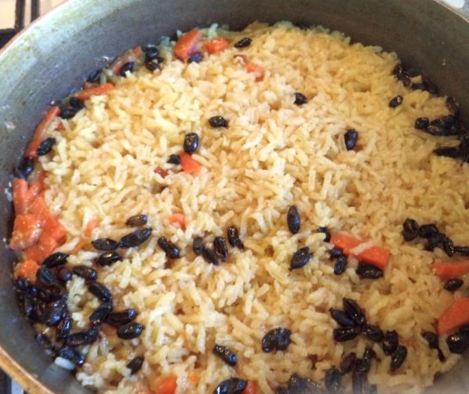 Lay out the rice, spread evenly over the entire surface. Add hot water so that it covers the rice by 2-3 centimeters. Do not stir! Bring the pilaf to a boil over high heat. Add unpeeled garlic. Make holes in several places with a spoon (for steam to escape).