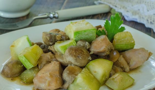 Salt and pepper to taste. Simmer chicken fillet with zucchini and mushrooms for another 5 minutes and turn off the heating.