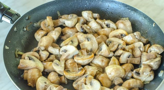 Put the mushrooms on the onion and fry until the liquid evaporates and is lightly browned.
