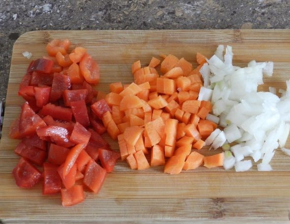 Dice the onion, carrot and bell pepper.