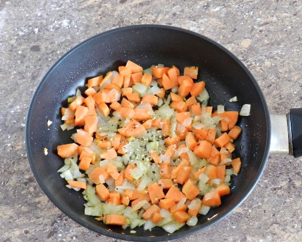 Heat oil in a frying pan, fry onions, and carrots until transparent, do not fry. Season with salt and spices.