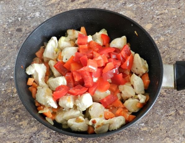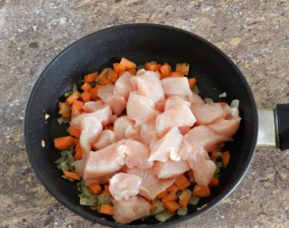 Place the chicken fillet and fry with the onions and carrots. The fillet should turn white, but not brown.