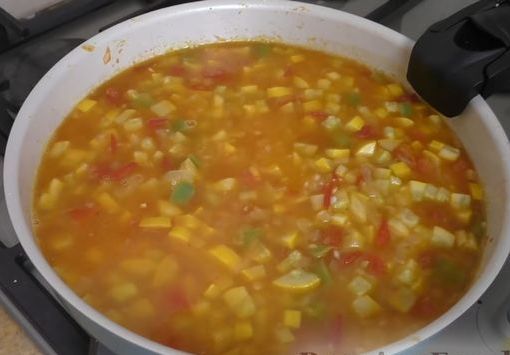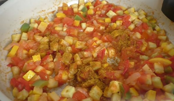 We send zucchini, tomatoes and bell peppers, also cut into cubes, to the pan. Saute over high heat for a couple of minutes.