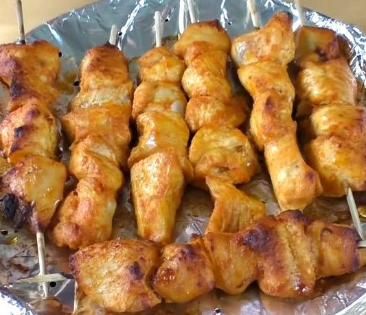 We turn on the oven to heat up to 180 degrees. Cover the frying pan (mine has a removable handle) with foil. We make many small holes in the foil. Pieces of chicken are placed on skewers and distributed on the foil.