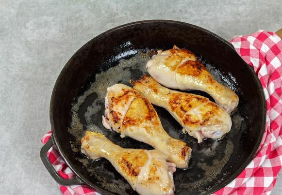 Place chicken drumsticks in a skillet and fry until golden brown (about 2-3 minutes) on one side. Then turn over and fry for about 2 more minutes, until golden brown on the other side.