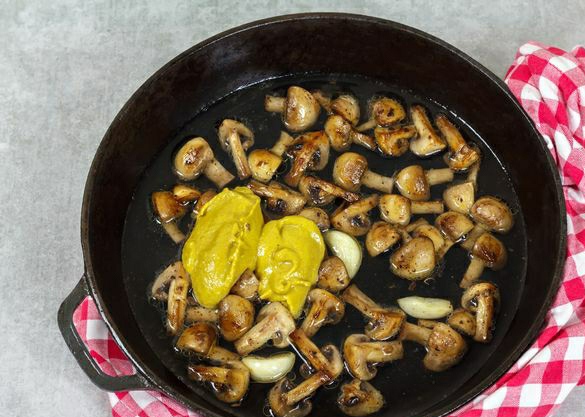Peel the cloves of garlic, add to the pan with the mushrooms and fry for another 2 minutes, until the garlic is lightly browned. Pour water into the pan, add the mustard, mix everything gently and bring the mixture to a boil.