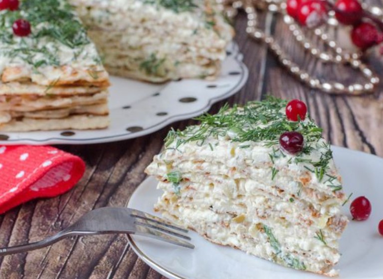 Chicken fillet pancake snack cake with spicy filling of cheese, pickled cucumbers and olives is ready.