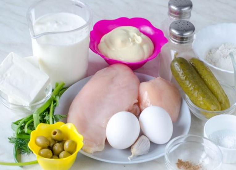 Making a chicken fillet snack cake is easy. You will certainly appreciate its spicy and bright taste. In this dish, the most delicate chicken pancakes are ideally complemented by a filling of melted cheese, pickled cucumbers and olives. Such an appetizer will become a worthy decoration of the festive table. Try to cook!